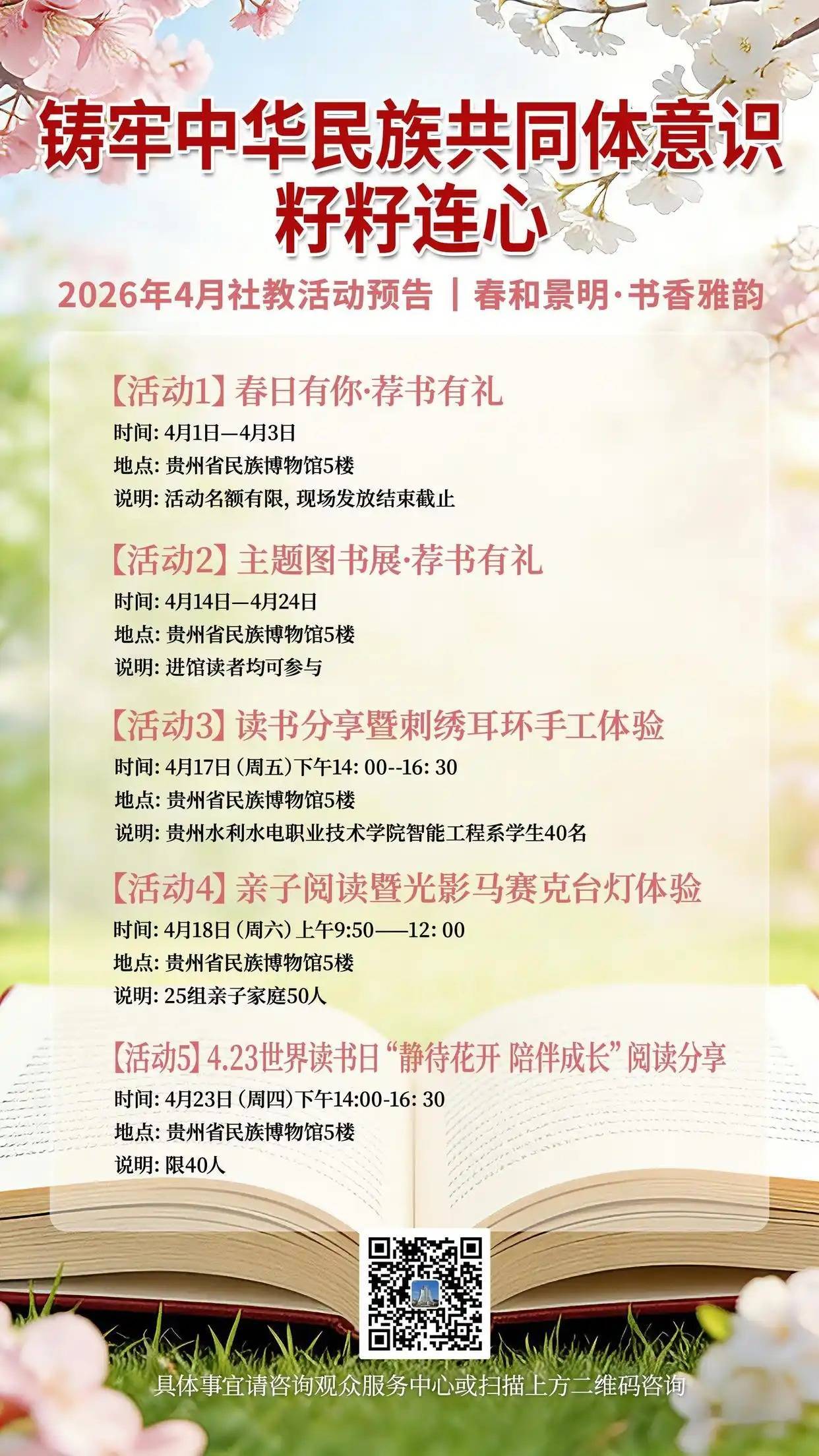 4月,贵州省民族博物馆将推出“春日有你·荐书有礼”“主题图书展”“读书分享暨刺绣耳环手工体验”“亲子阅读暨光影马赛克台灯体验”“4.23世界读书日‘静待花开 陪伴成长’阅读分享”等多项社教活动,通过一系列阅读活动丰富群众精神文化生活,传承弘扬民族优秀传统文化。