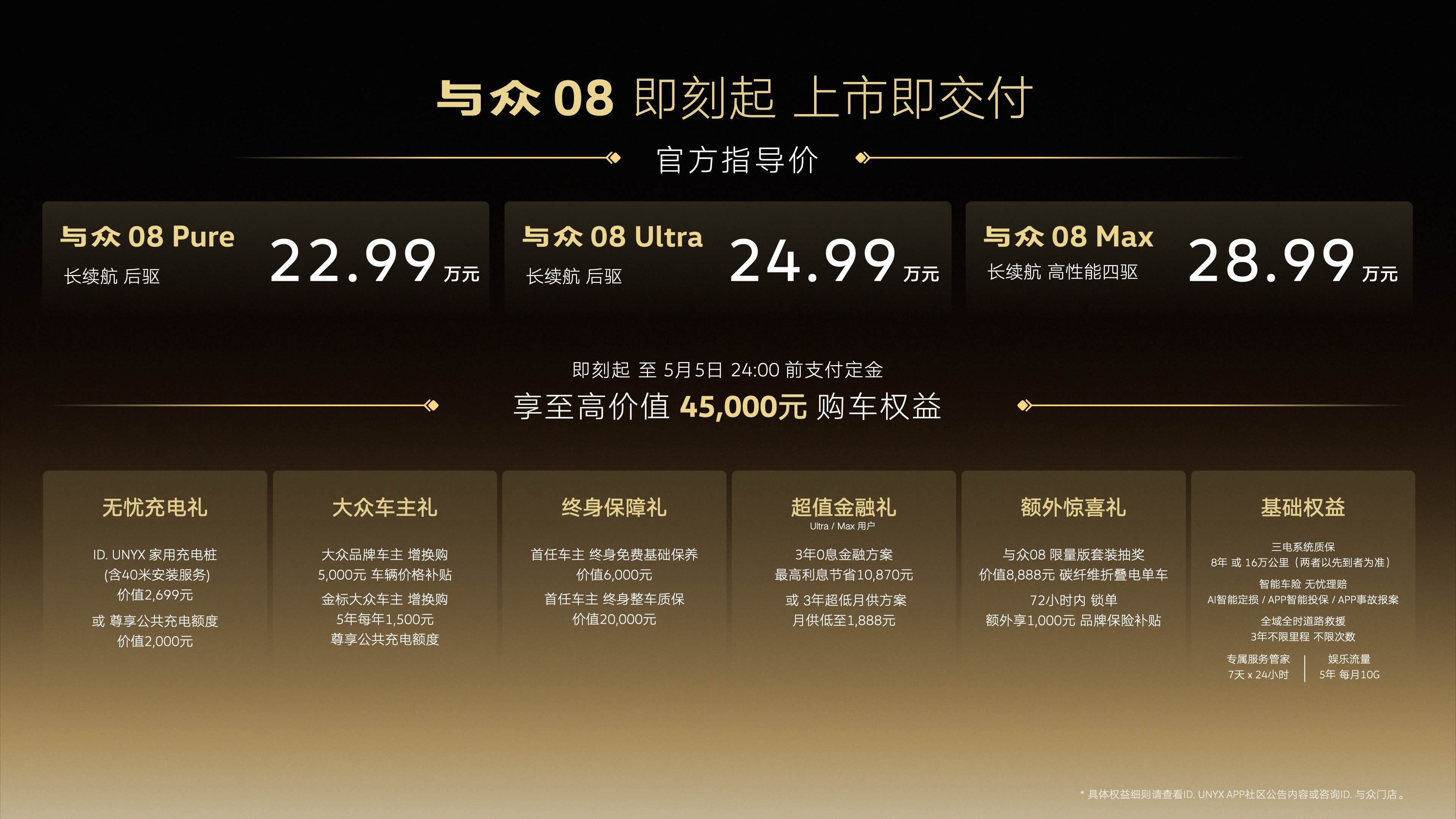 日前,金标大众旗下首款纯电SUV——与众08正式上市,新车推出了Pure、Ultra、Max共3个版本,指导价为22.99万—28.99万元。